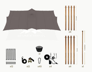 The set includes Douglas wooden sidespoles (Ø 75 mm) fitted with galvanized steel eyelets, black tension straps with ratchets, ground pegs, pole cap and carabiners. The center poles (Ø 95 mm) comes with a protective end cap.