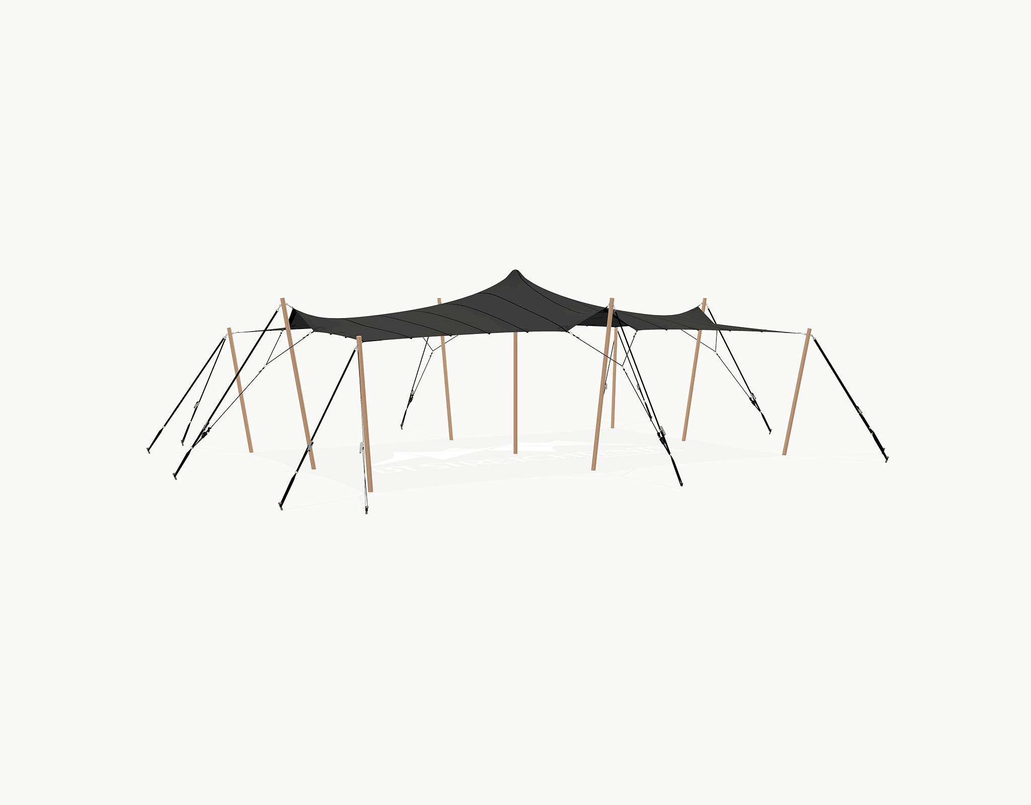 The set includes Douglas wooden sidespoles (Ø 75 mm) fitted with galvanized steel eyelets, black tension straps with ratchets, ground pegs, pole cap and carabiners. The center poles (Ø 95 mm) comes with a protective end cap.