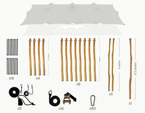 The set includes Robinia ø 70-90 mm wooden poles fitted with galvanized steel eyelets, black tension straps with ratchets, ground pegs, pole cap and carabiners, providing a stable and secure structure.