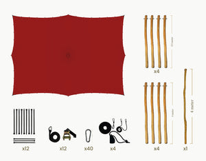 The set includes Robinia ø 70-90 mm wooden poles fitted with galvanized steel eyelets, black tension straps with ratchets, ground pegs, pole cap and carabiners, providing a stable and secure structure.