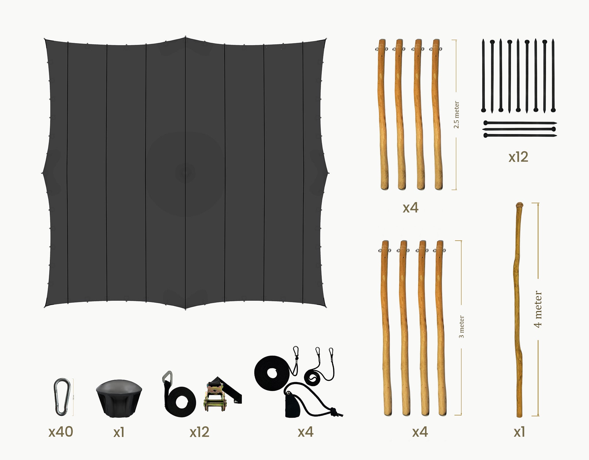 The set includes Robinia ø 70-90 mm wooden poles fitted with galvanized steel eyelets, black tension straps with ratchets, ground pegs, pole cap and carabiners, providing a stable and secure structure.