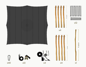 The set includes Robinia ø 70-90 mm wooden poles fitted with galvanized steel eyelets, black tension straps with ratchets, ground pegs, pole cap and carabiners, providing a stable and secure structure.