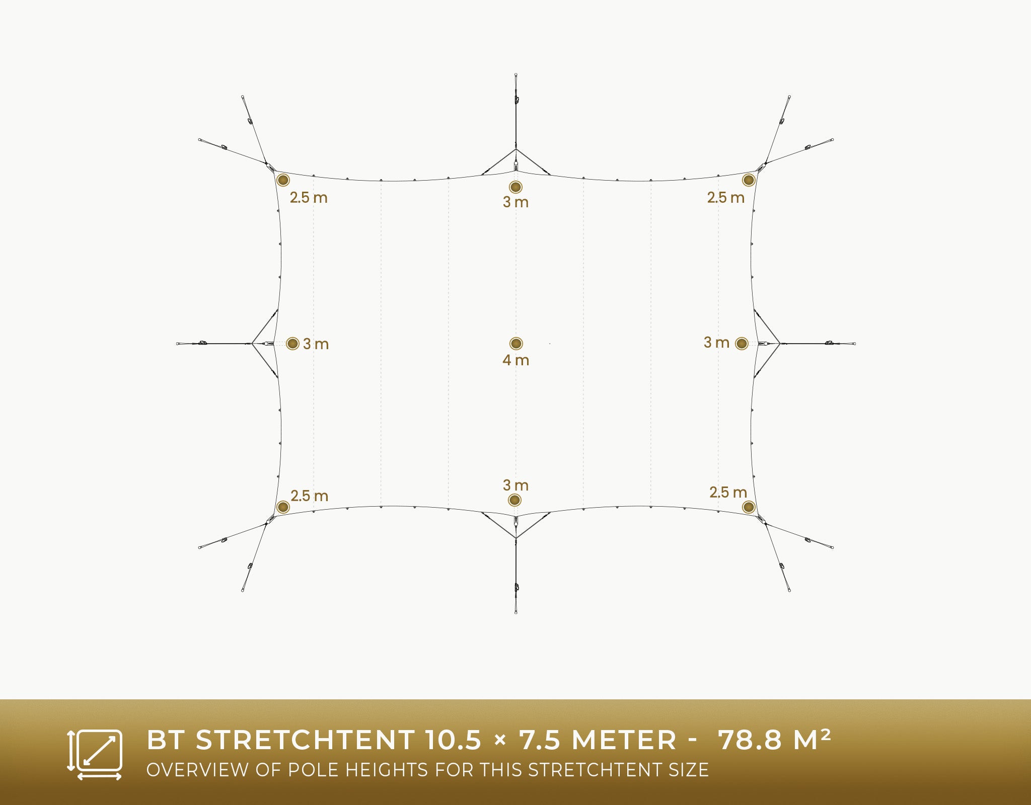 Produced in Europe and supplied from stock, the 10.5 × 7.5 meter stretchtent is a complete, high-quality, ready-to-install system.