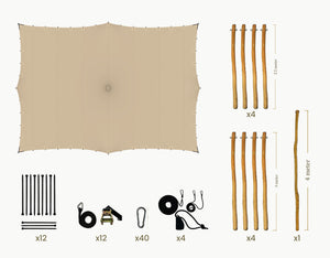 The set includes Robinia ø 70-90 mm wooden poles fitted with galvanized steel eyelets, black tension straps with ratchets, ground pegs, pole cap and carabiners, providing a stable and secure structure.