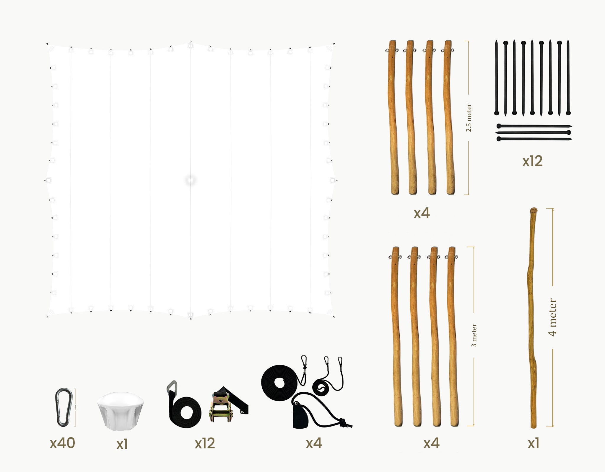 The set includes Robinia ø 70-90 mm wooden poles fitted with galvanized steel eyelets, black tension straps with ratchets, ground pegs, pole cap and carabiners, providing a stable and secure structure.