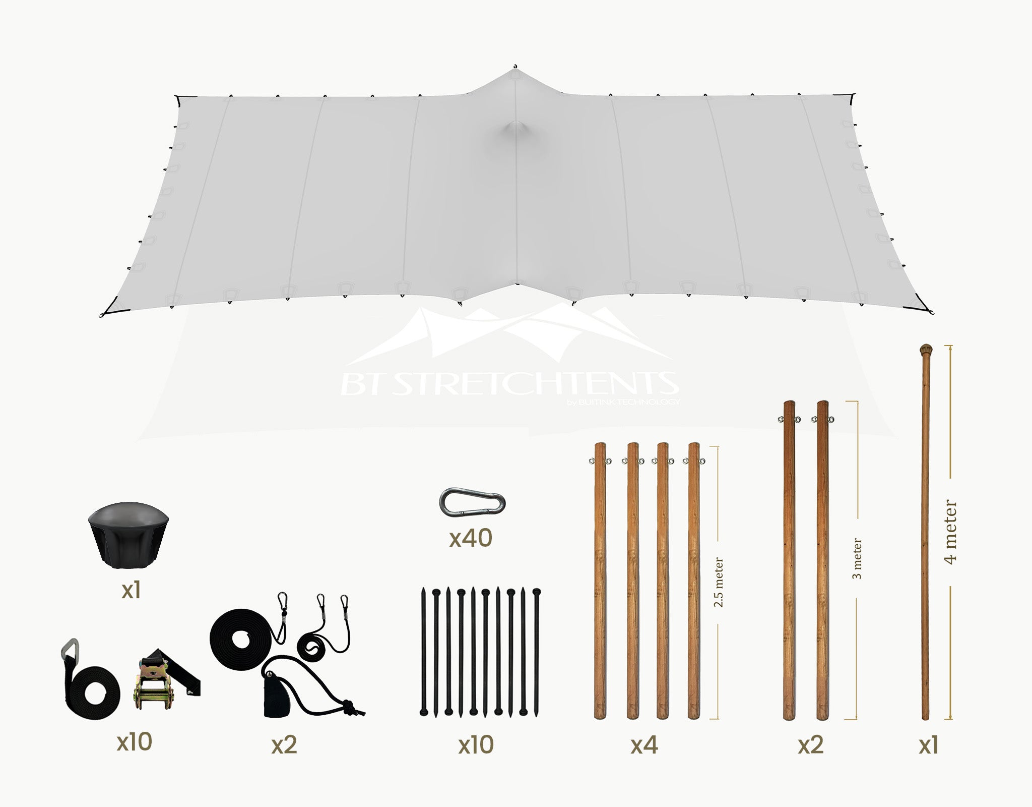 Material: 4-layer stretch fabric, water-, windproof and UV-stable Weight: 800 g/m² Surface: Smooth finish, high elasticity, weather-resistant Fire behaviour: M2/B1 flame-retardant standard Structural standard: EN 13782 (temporary demountable structures) Wind resistance: Up to 9 Beaufort (with proper installation) Douglas wooden poles, ø 75 mm with galvanized eyelets Ratchet strap 1.5T black belt with ratchtet Rope set with rope ratchtet 500 lbs (226kg) Ground pegs ø30 mm, length: 1000 mm Hardware: galvanized steel components Care: Clean with mild pH‑neutral soap; dry before storage Use: Compatible with BT Stretchtents poles, caps, belts, and accessories