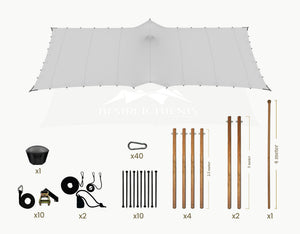 The set includes Douglas wooden sidespoles (Ø 75 mm) fitted with galvanized steel eyelets, black tension straps with ratchets, ground pegs, pole cap and carabiners. The center poles (Ø 95 mm) comes with a protective end cap.
