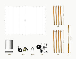 The set includes Robinia ø 70-90 mm wooden poles fitted with galvanized steel eyelets, black tension straps with ratchets, ground pegs, pole cap and carabiners, providing a stable and secure structure.