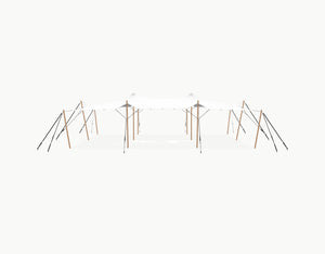 The set includes Douglas wooden sidespoles (Ø 75 mm) fitted with galvanized steel eyelets, black tension straps with ratchets, ground pegs, pole cap and carabiners. The center poles (Ø 95 mm) comes with a protective end cap.