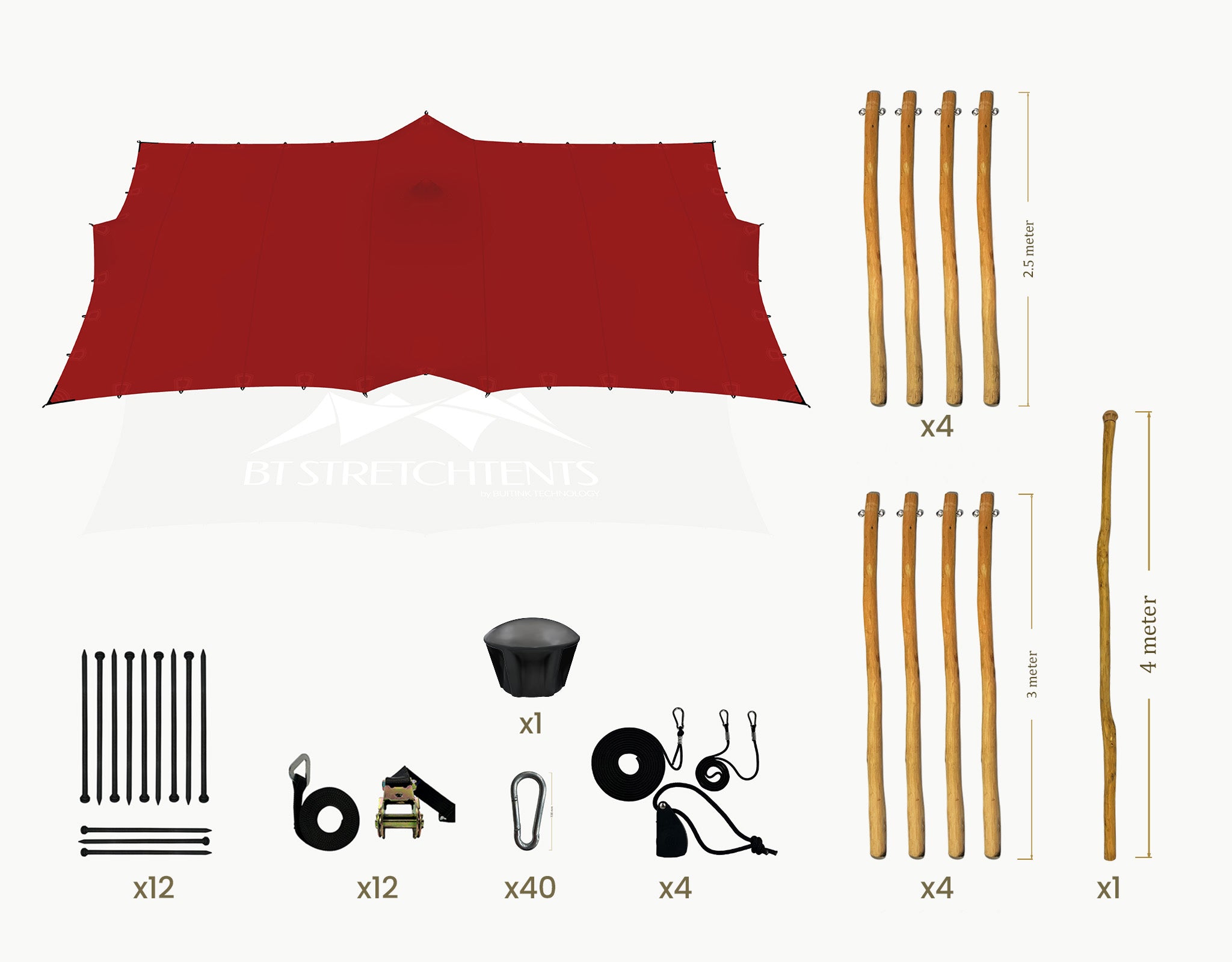 Material: 4-layer stretch fabric, water-, windproof and UV-stable Weight: 800 g/m² Surface: Smooth finish, high elasticity, weather-resistant Fire behaviour: M2/B1 flame-retardant standard Structural standard: EN 13782 (temporary demountable structures) Wind resistance: Up to 9 Beaufort (with proper installation) Robinia wooden poles, ø 70-90 mm with galvanized eyelets Ratchet strap 1.5T black belt with ratchtet Rope set with rope ratchtet 500 lbs (226kg) Ground pegs ø30 mm, length: 1000 mm Hardware: galvanized steel components Care: Clean with mild pH‑neutral soap; dry before storage Use: Compatible with BT Stretchtents poles, caps, belts, and accessories