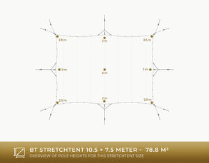 Produced in Europe and supplied from stock, the 10.5 × 7.5 meter stretchtent is a complete, high-quality, ready-to-install system.