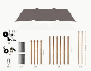 The set includes Douglas wooden sidespoles (Ø 75 mm) fitted with galvanized steel eyelets, black tension straps with ratchets, ground pegs, pole cap and carabiners. The center poles (Ø 95 mm) comes with a protective end cap.