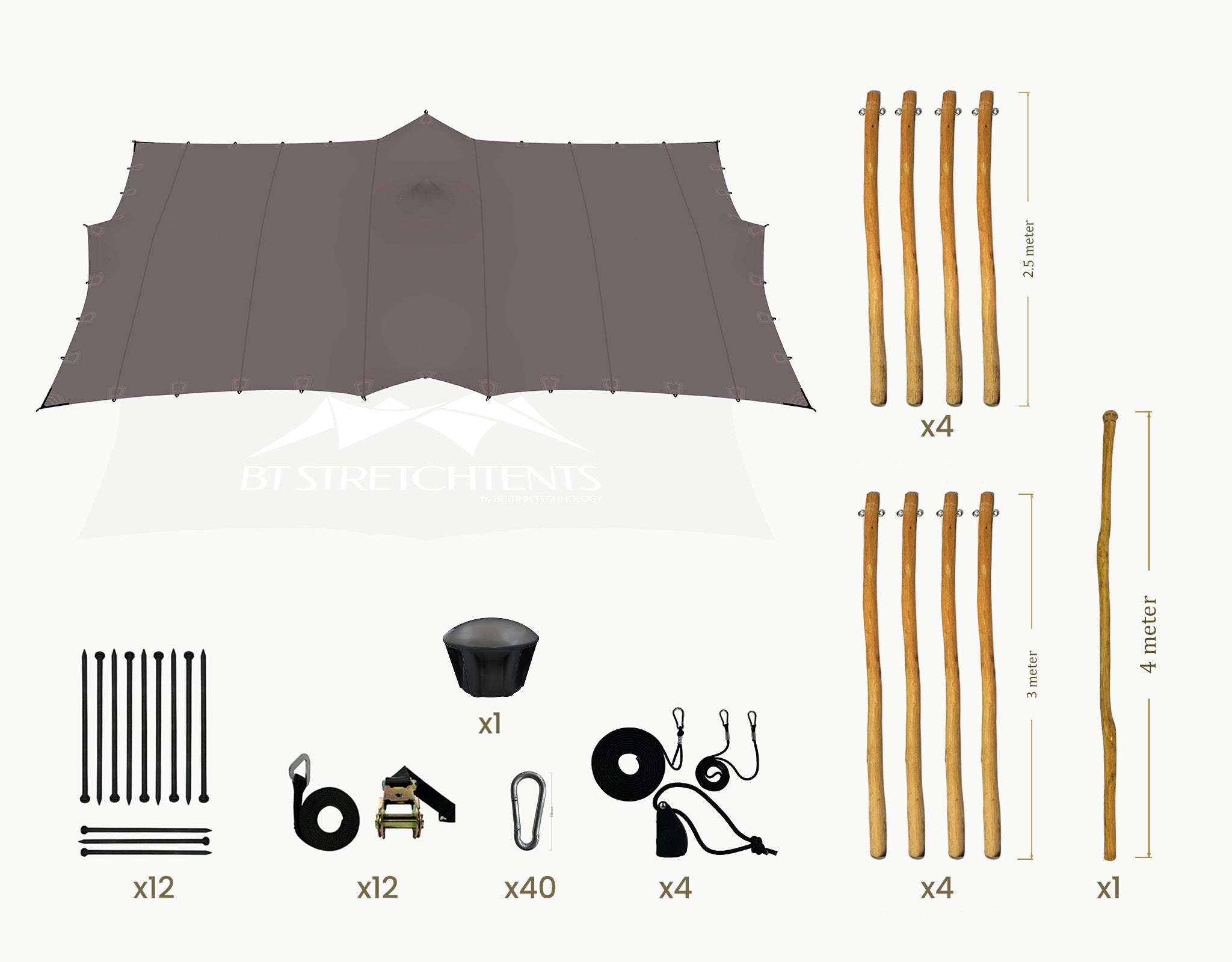 Material: 4-layer stretch fabric, water-, windproof and UV-stable Weight: 800 g/m² Surface: Smooth finish, high elasticity, weather-resistant Fire behaviour: M2/B1 flame-retardant standard Structural standard: EN 13782 (temporary demountable structures) Wind resistance: Up to 9 Beaufort (with proper installation) Robinia wooden poles, ø 70-90 mm with galvanized eyelets Ratchet strap 1.5T black belt with ratchtet Rope set with rope ratchtet 500 lbs (226kg) Ground pegs ø30 mm, length: 1000 mm Hardware: galvanized steel components Care: Clean with mild pH‑neutral soap; dry before storage Use: Compatible with BT Stretchtents poles, caps, belts, and accessories
