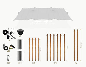 The set includes Douglas wooden sidespoles (Ø 75 mm) fitted with galvanized steel eyelets, black tension straps with ratchets, ground pegs, pole cap and carabiners. The center poles (Ø 95 mm) comes with a protective end cap.
