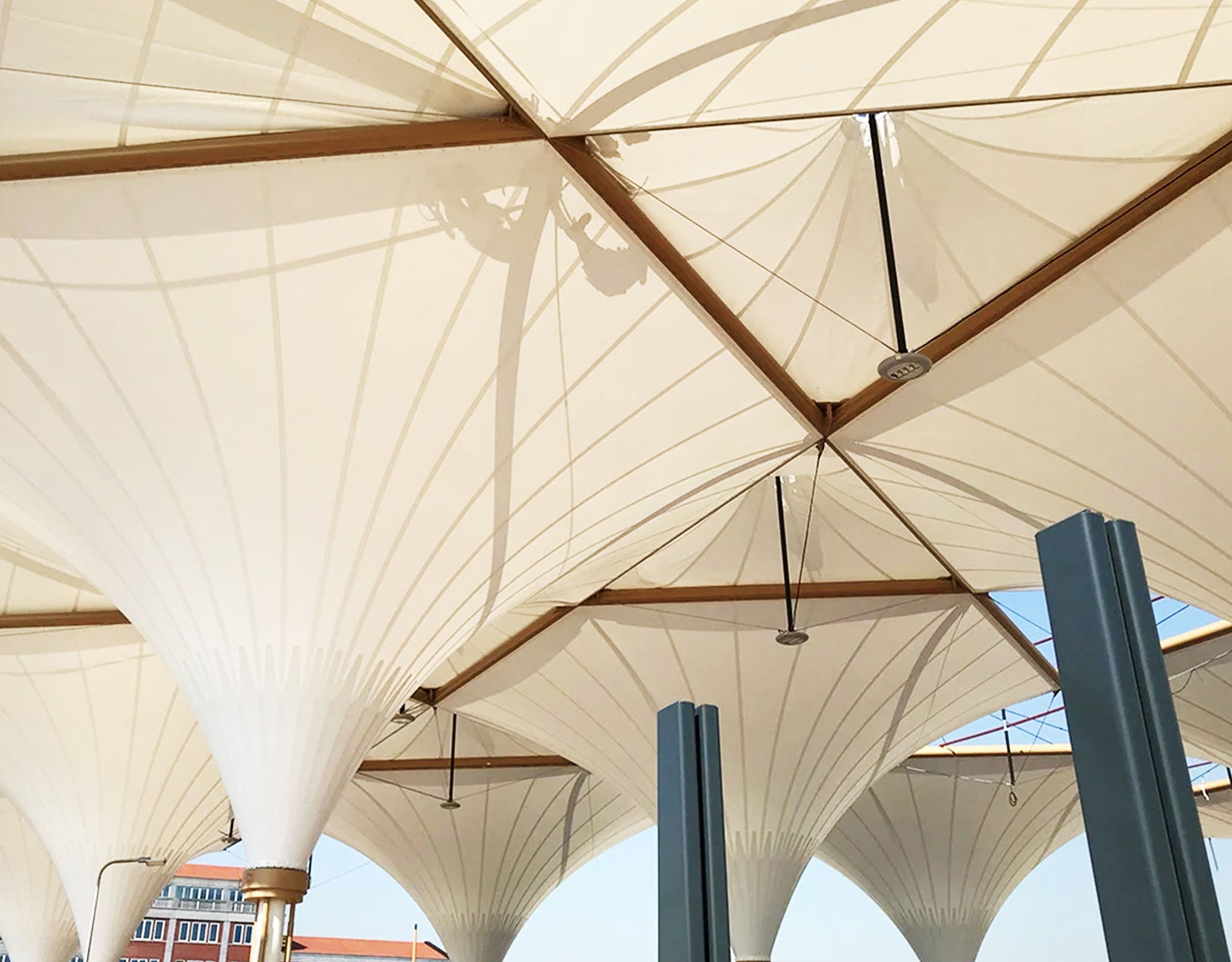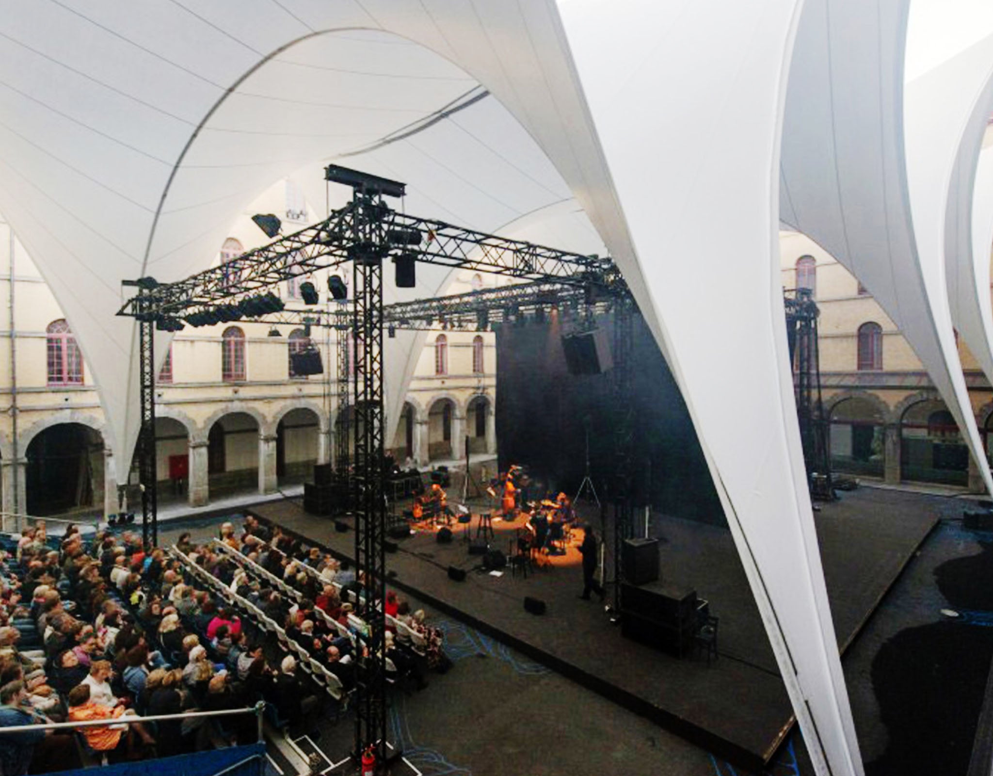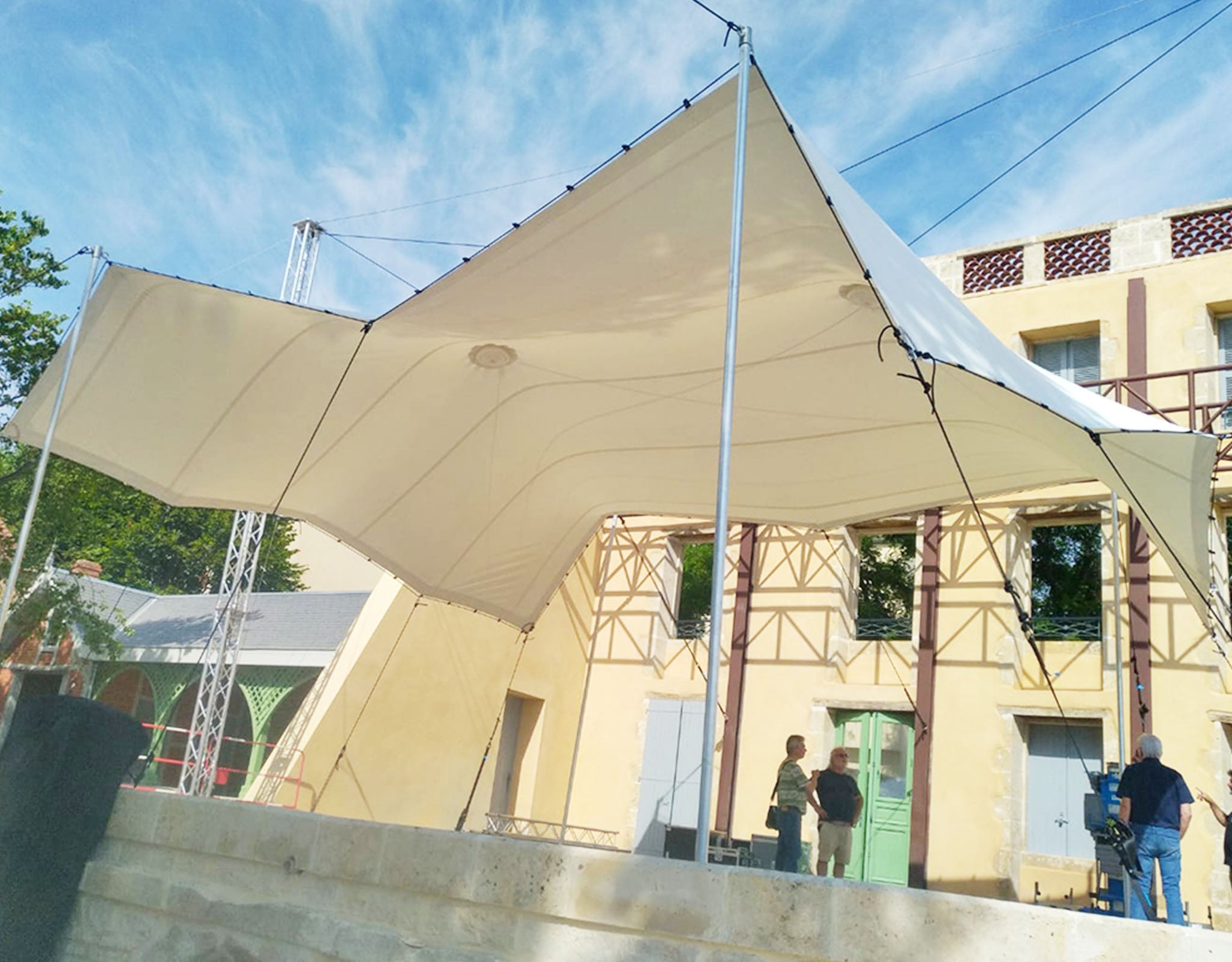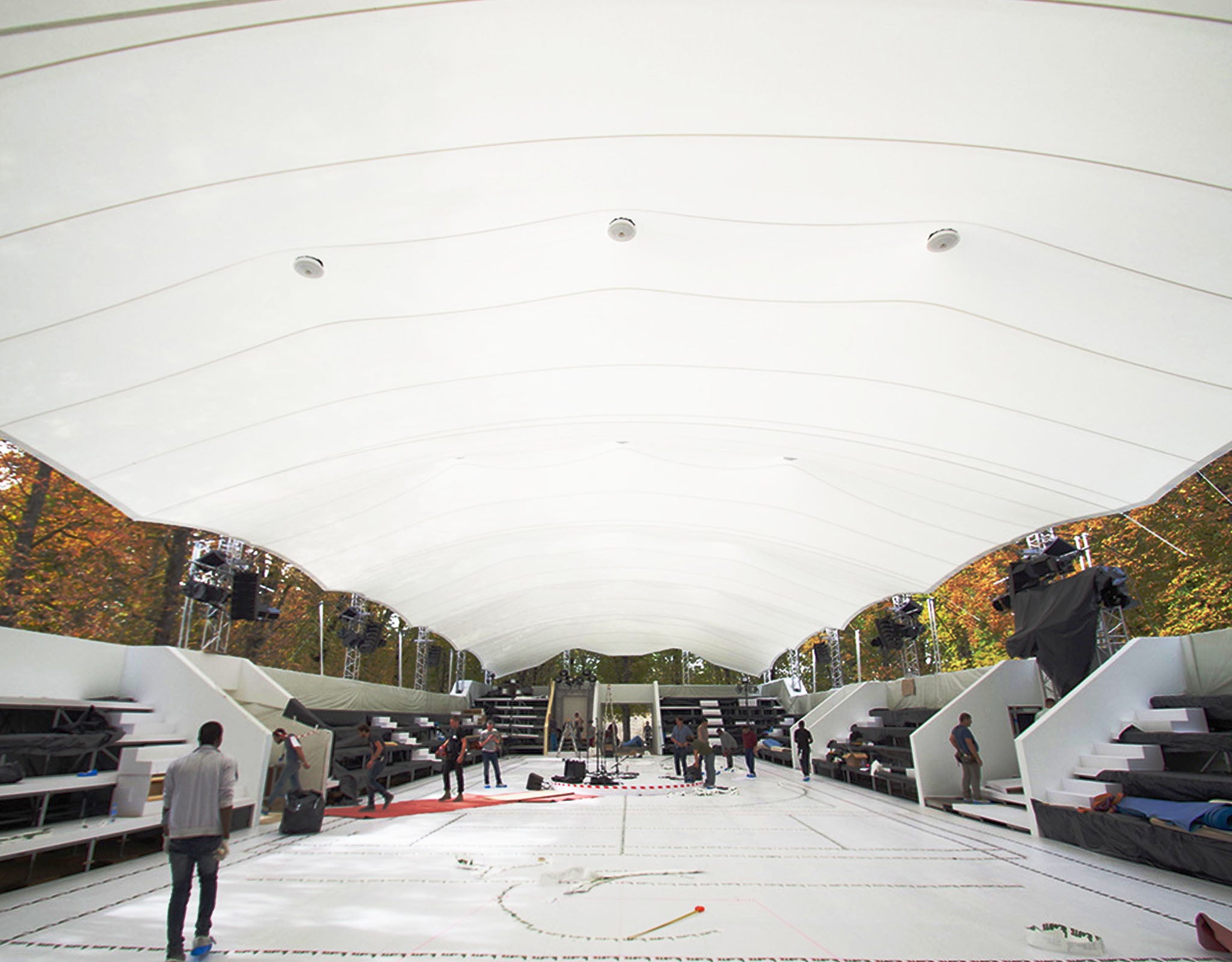 Our fabrics are certified flame-retardant according to European M2 and B1 standards and meet EN 13782 structural calculations for temporary outdoor structures.