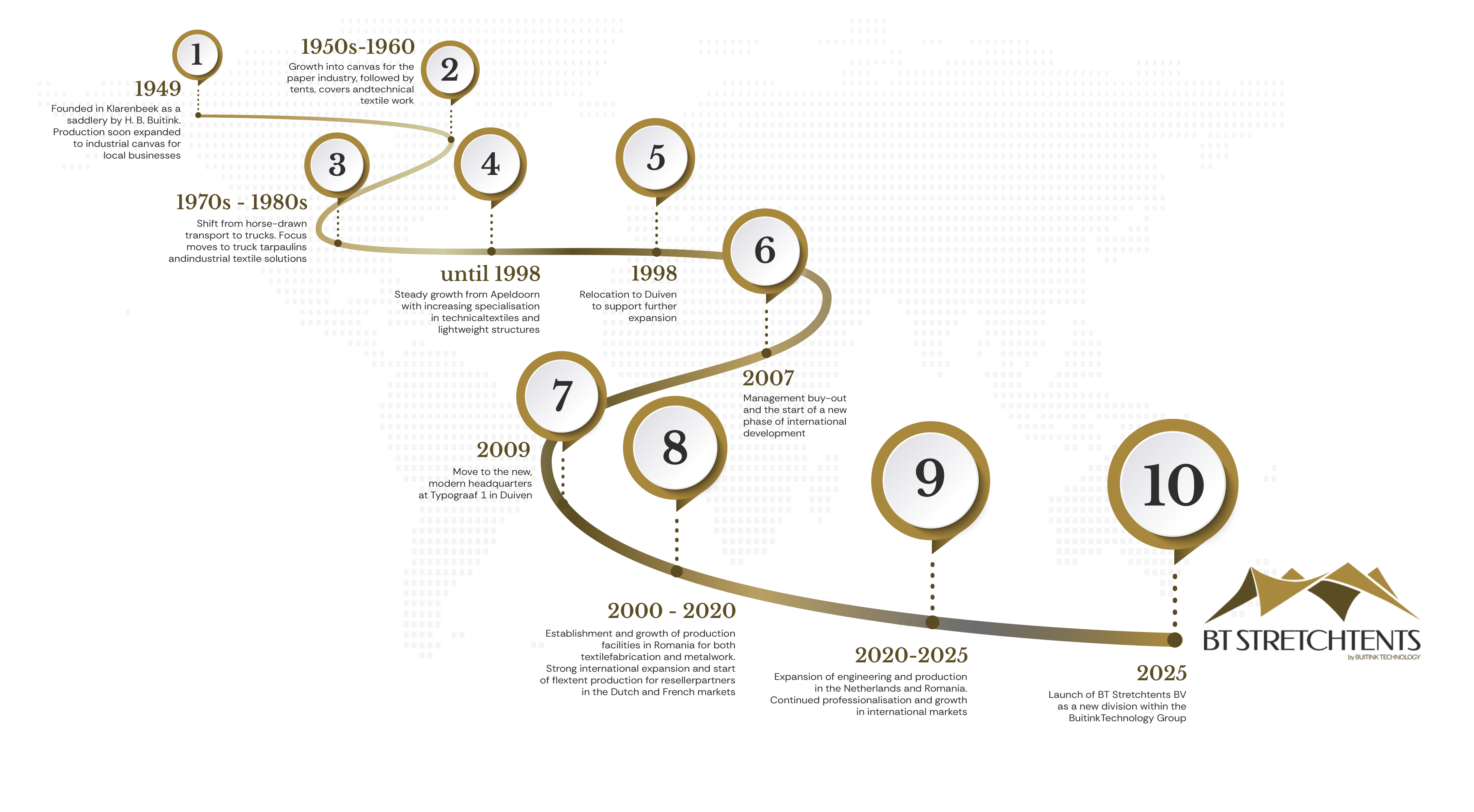 BT Stretchtents is part of Buitink Technology, a Dutch company that has been producing innovative products made from technical textiles, sailcloth and foil since 1949.