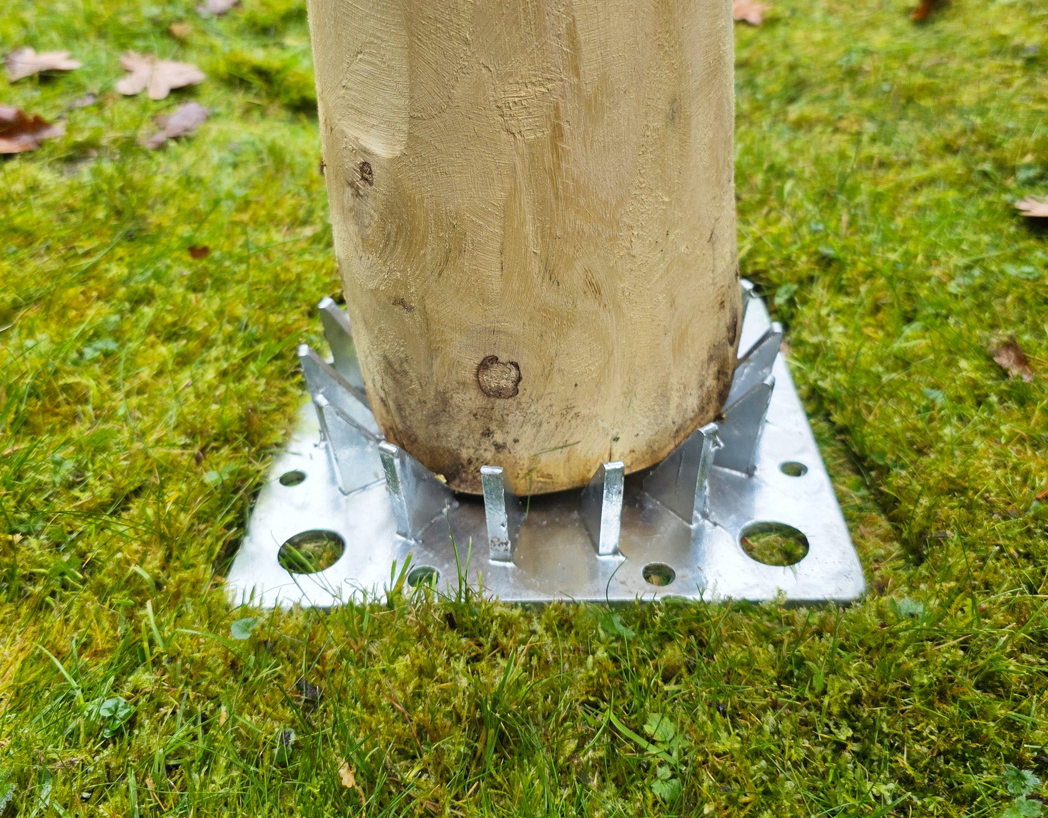 The holder features pre-drilled anchor holes for flexible installation: it can be fixed with ground pegs on soft surfaces, or bolted to wooden decks or concrete bases