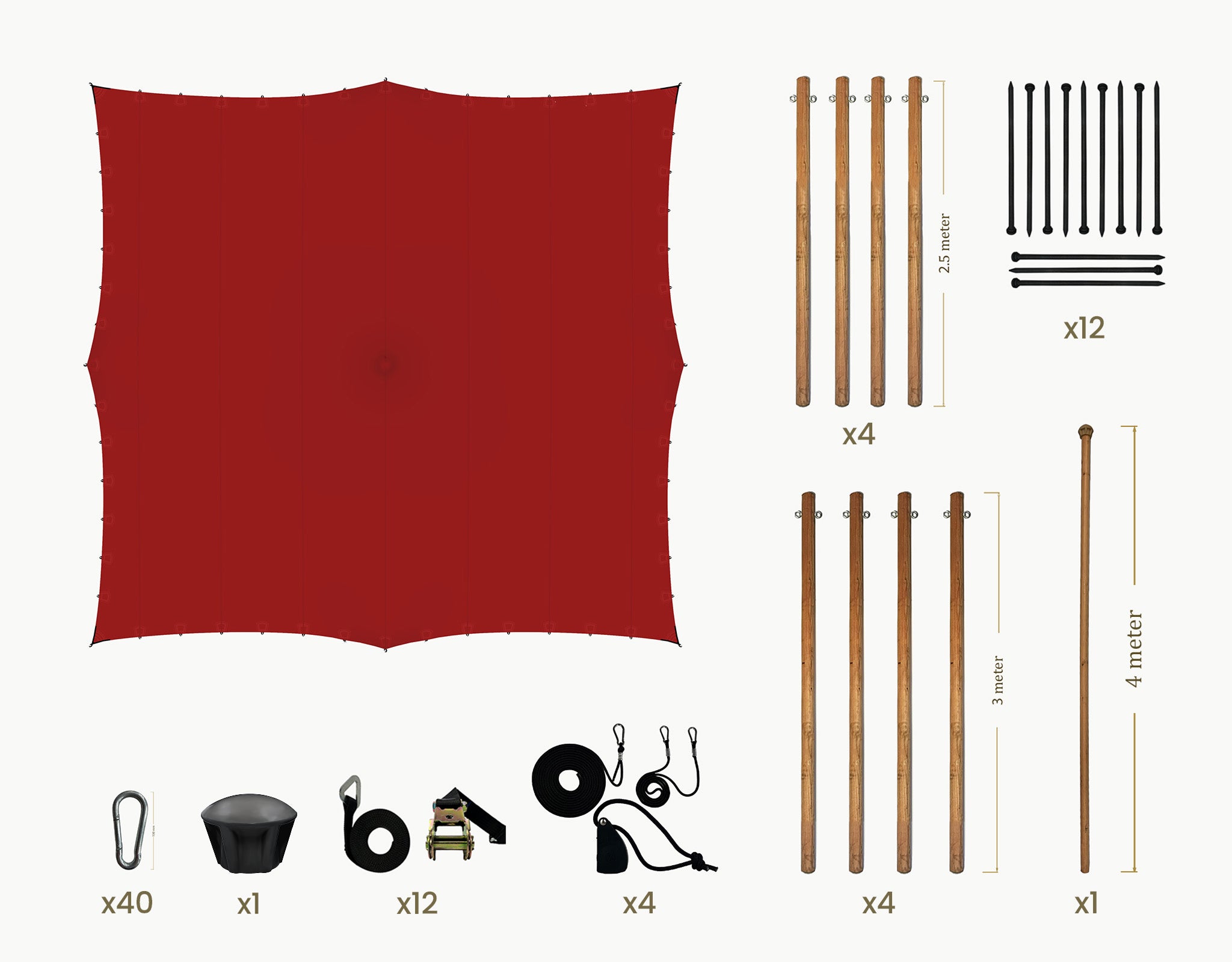 The set includes Douglas wooden sidespoles (Ø 75 mm) fitted with galvanized steel eyelets, black tension straps with ratchets, ground pegs, pole cap and carabiners. The center poles (Ø 95 mm) comes with a protective end cap.